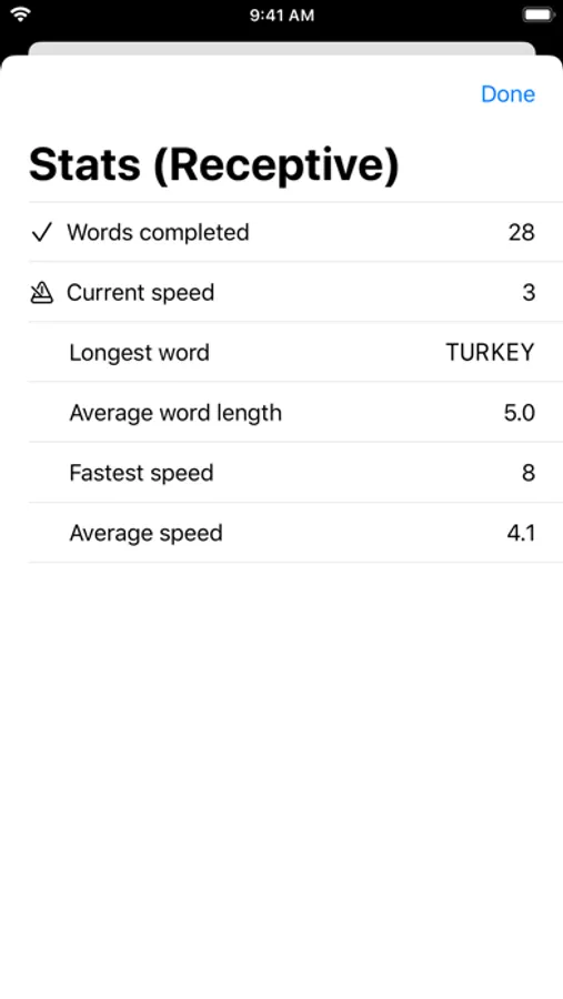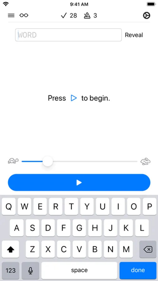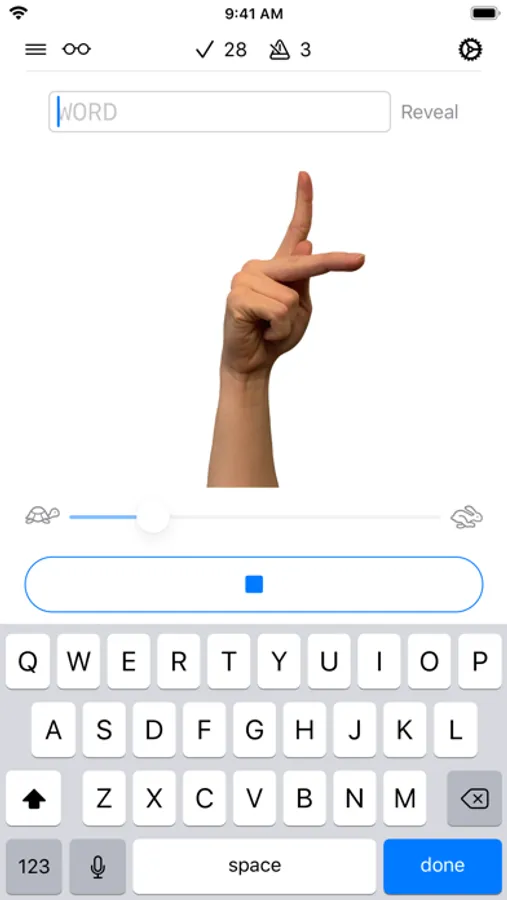RECEPTIVE MODE: Watch as words are fingerspelled then type what you saw. Increase the speed to challenge yourself.