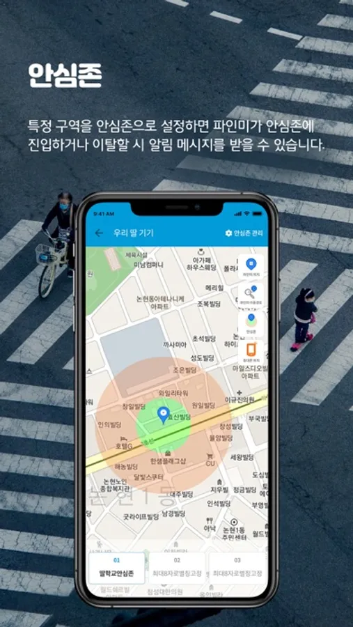 - 특정 구역을 안심존으로 설정하면 안심존 반경(100m~10km) 내에서 파인미가 벗어날 시 앱으로 알림 메시지가 전송됩니다.