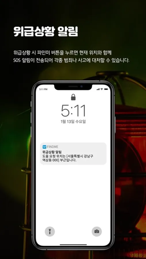 - 어린이, 여성, 노인 등 가족에게 위급상황이 발생했을 때 파인미의 버튼을 누르면 보호자에게 SOS 알림 메시지와 현재 위치정보가 전송됩니다.