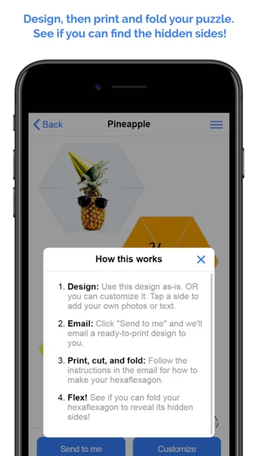 Please note that after a limited trial, a $3.99 unlimited use upgrade is required in order to have the app send you designs that you can print and fold at home.