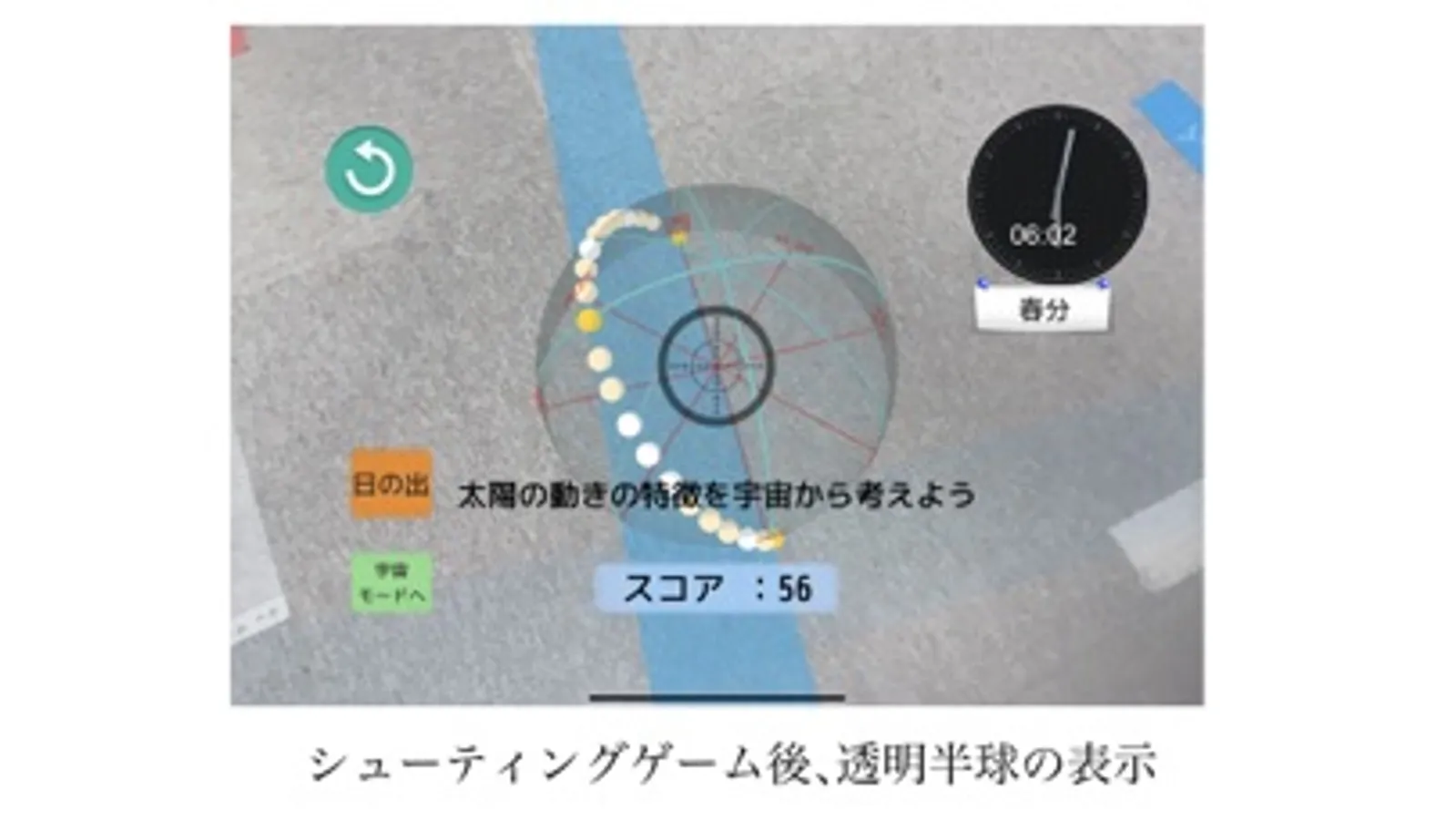 ゲーム終了後、プレイヤーの周囲にある天球が縮小し、目の前に透明半球として現れます。これにより、一日の太陽の動きを俯瞰目線から確認することができます。また、地上視点(天球)から宇宙視点(透明半球)への視点移動を疑似体験することができます。