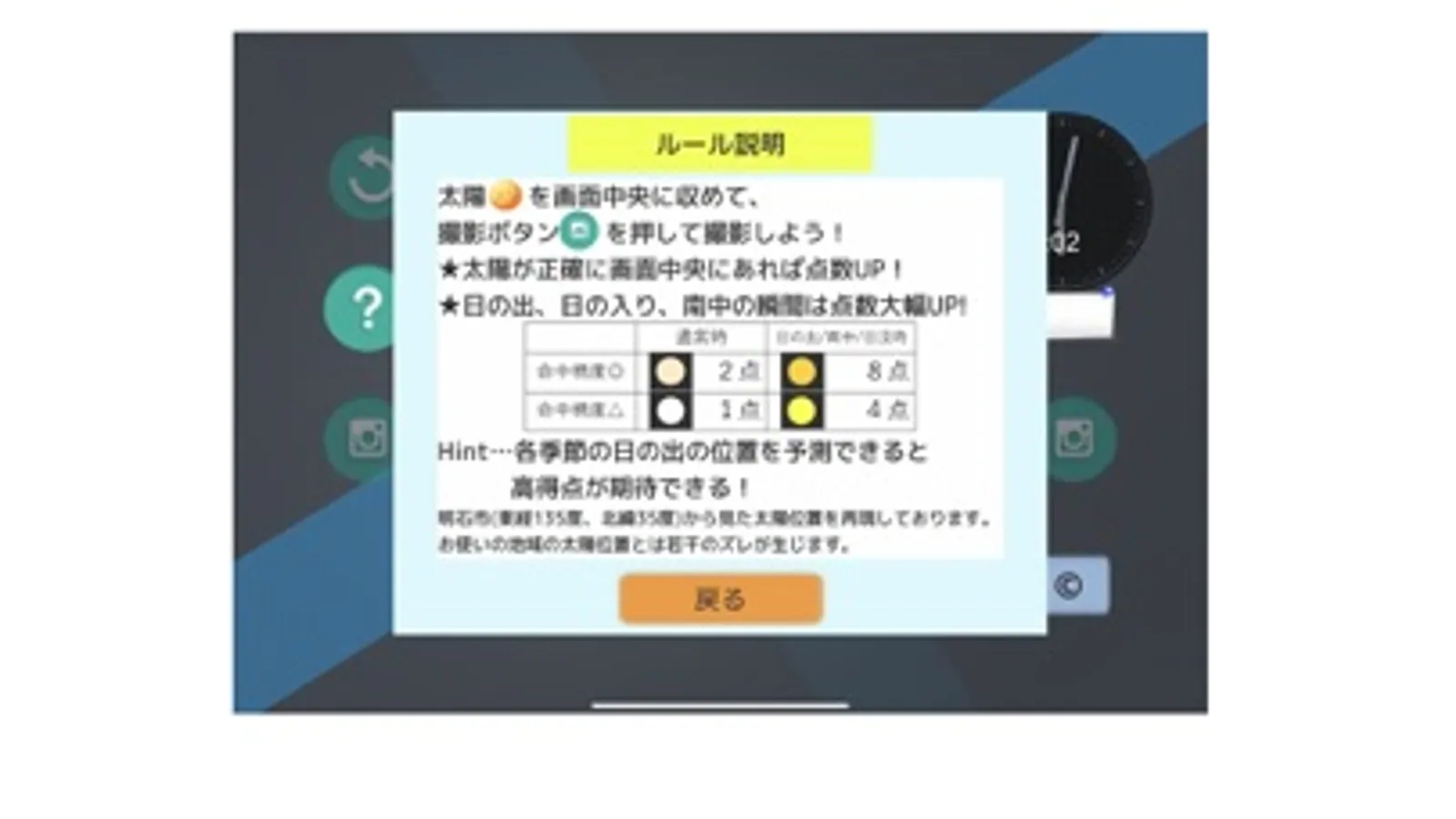 各季節(春分、夏至、冬至)の太陽が昇ってくるので、タブレットを太陽の方向に掲げて「撮影ボタン」を押して、写真を撮影しましょう。多くの写真や特別な写真(スペシャルショット)を撮ることができれば高得点!!