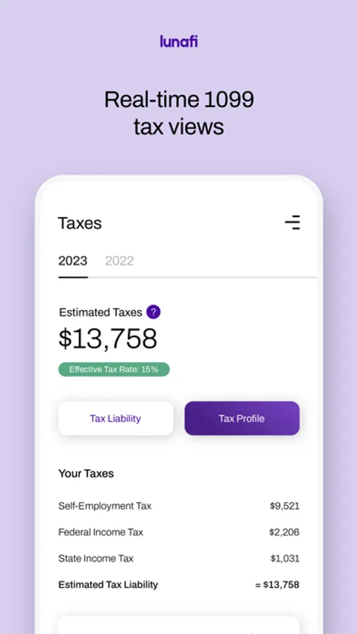 - 1099 tax calculator: See the estimation for your 1099 tax and federal income taxes for your freelance business with the self-employed tax calculator feature. Lunafi tax estimation works as a freelance tax calculator or a gig worker tax calculator.