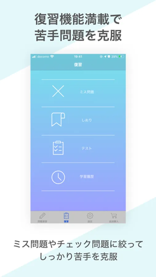 テスト機能、ミス問題だけを復習、苦手な問題をチェックしてチェック問題のみ復習で着実にレベルアップ。