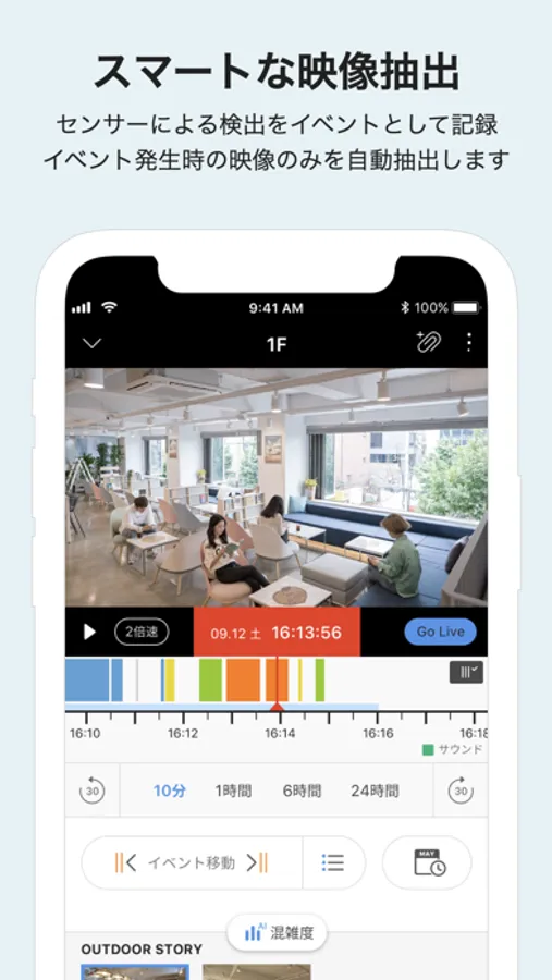 店舗に警備通知を設定しておけば、サウンドとモーションを検知し、リアルタイムで通知します。