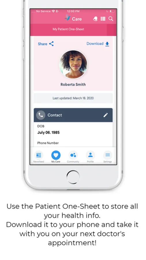 • Keep everything in one place with our Patient One-Sheet, a secure, printable, and shareable form that allows you to easily store and maintain all your basic information – doctors, insurance info, medications, and their dosages, and other key data.