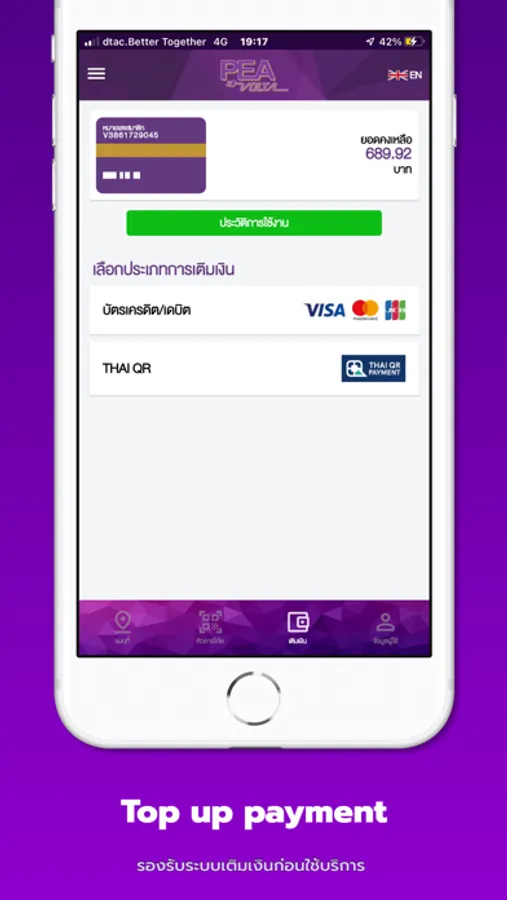 5. สามารถเช็คประวัติการใช้งานย้อนหลังได้ เช่นการเติมเงิน, การใช้เงิน และการชาร์จ