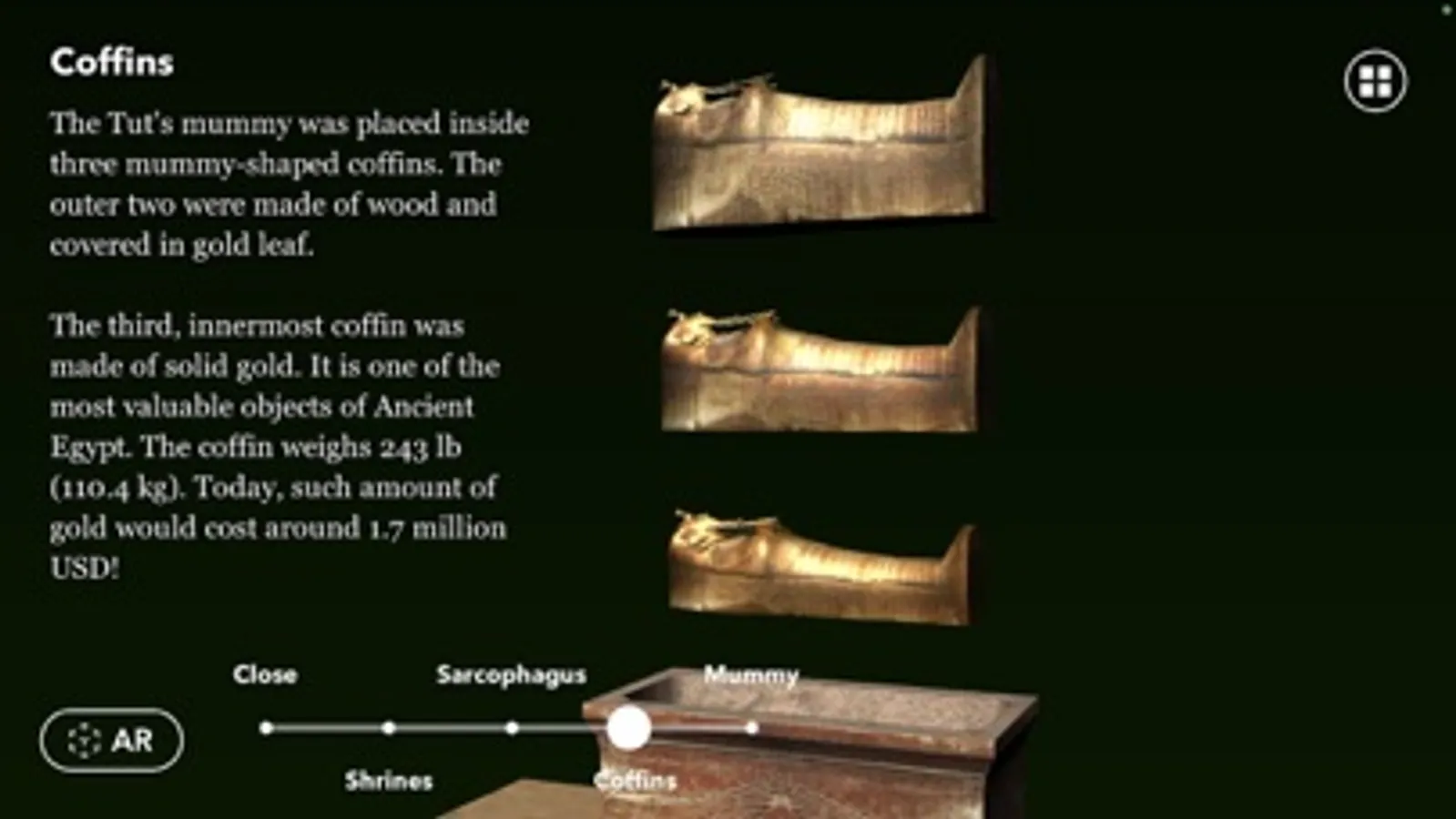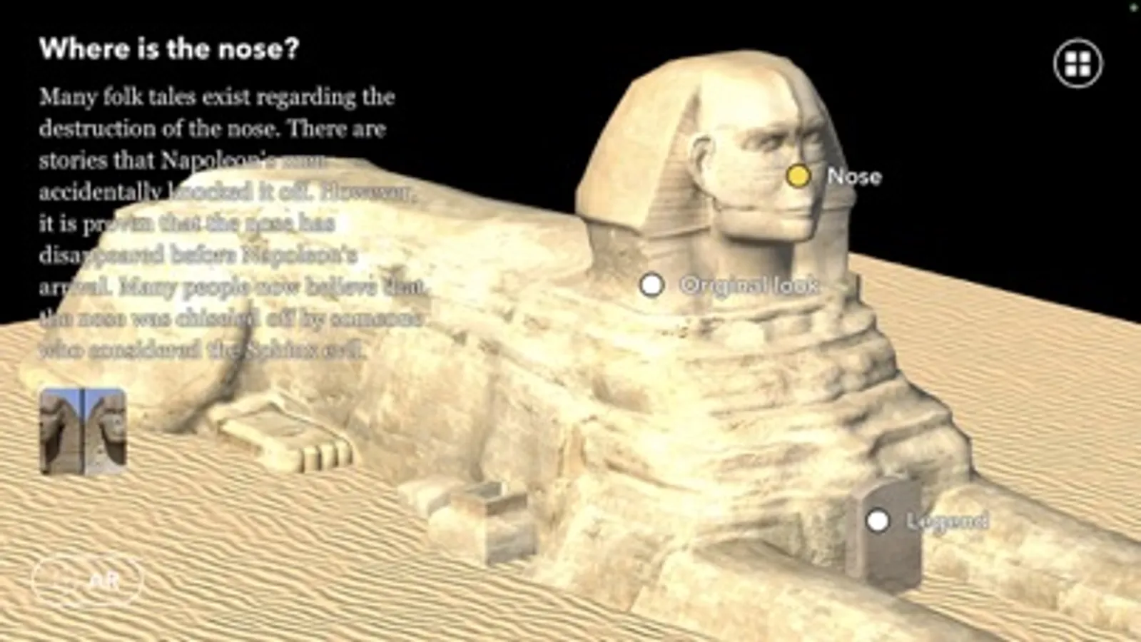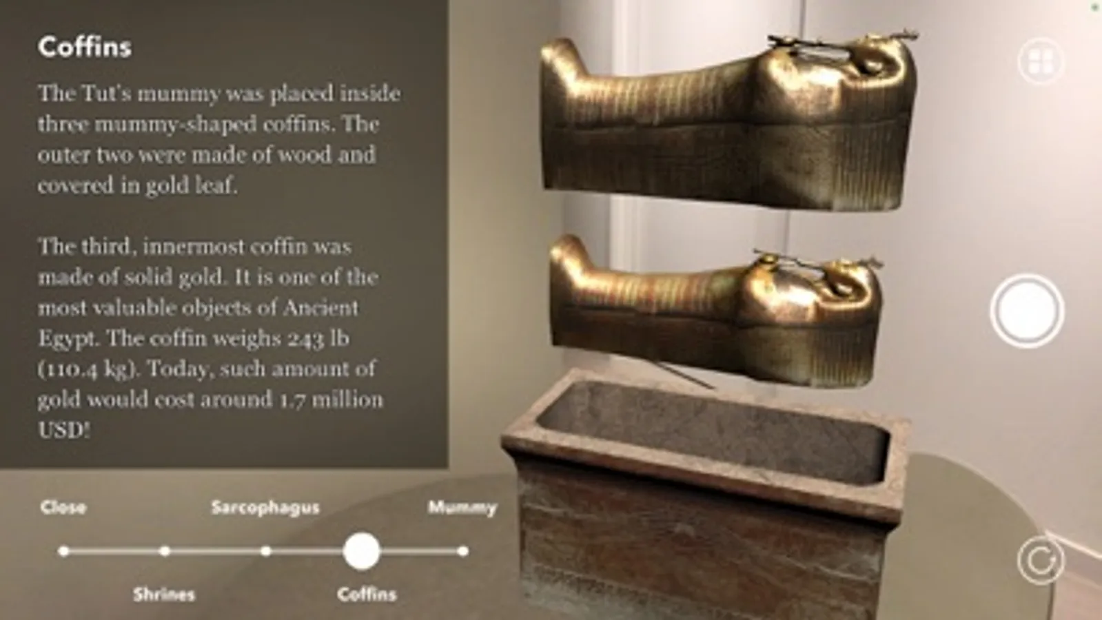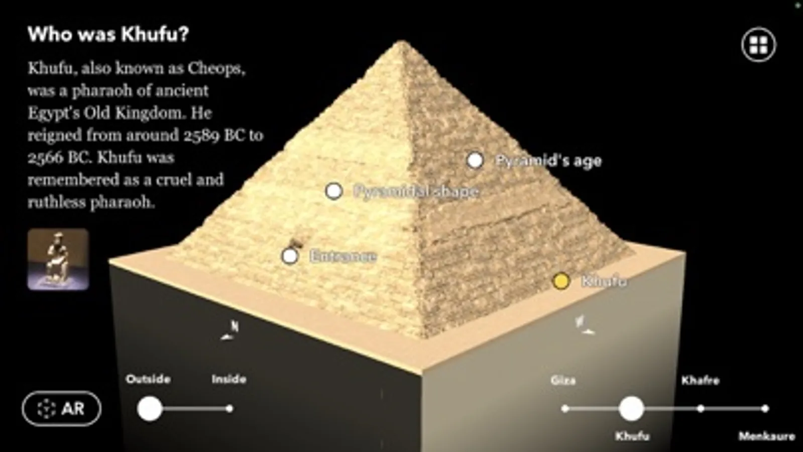 Ancient Egypt is an alluring topic for both kids and grown-ups. Tutankhamun AR provides an immersive educational experience beyond what books and videos can offer. In our app, curious minds explore 3D models of Giza Pyramids, the Great Sphinx, Tutankhamun's Mask, and other artifacts from the Ancient World. Each model comes with a rich set of bite-sized facts. Children learn as they go.