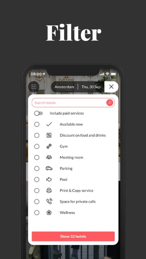 Bookings include a free cup of coffee, fast wifi and additional benefits that vary per hotel. Discounts on food and drinks, and hotel facilities such as meeting rooms, parking, gym and even the swimming pool. Whatever you need for a productive day of work and a spark of energy.