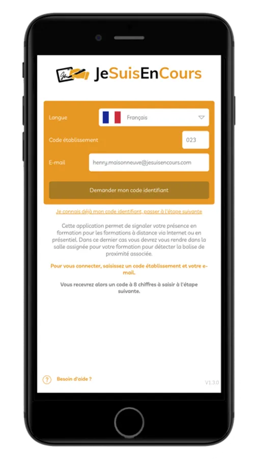 L’utilisation de cette application nécessite un abonnement à la solution JeSuisEnCours qui fournit le code identifiant nécessaire au démarrage de l’application.