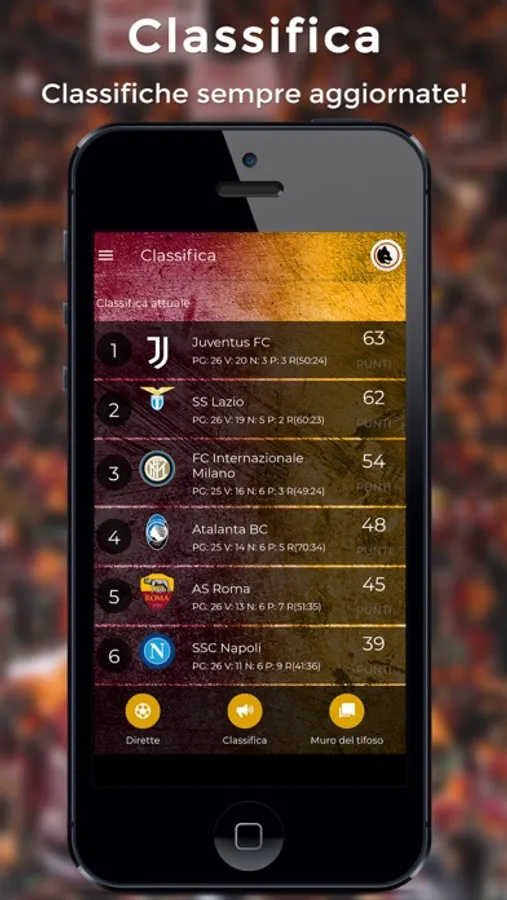 Gli appassionati dela Roma avranno accesso al mondo del loro Club con notizie sempre aggiornate, dirette testuali LIVE delle partite, classifiche, rubriche per i Tifosi e notifiche in tempo reale.