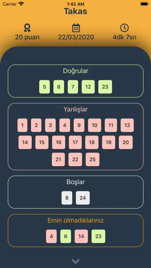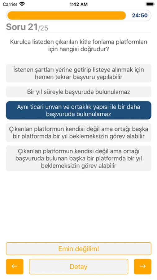 Uygulama içinde her biri 25 adet sorudan oluşan sınavlar mevcuttur. Her bir sınavı tamamladıktan sonra yanlış cevaplarınızı görebileceksiniz. Ve sadece yanlış cevaplar için değil, tüm sorular için açıklamaları da sınav sonlarında bulacaksınız.
