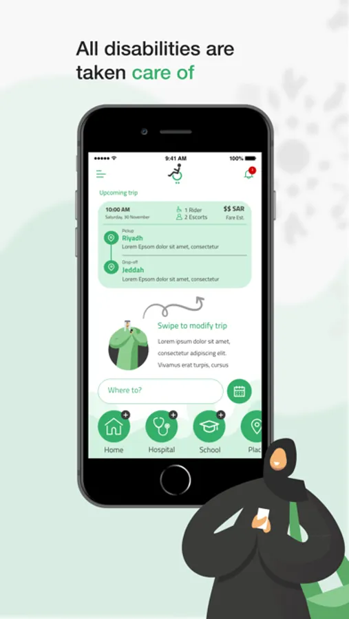 تم إنشاء هذا التطبيق خصيصًا لذوي الاحتياجات الخاصة، يضم سائقين ماهرين ومدربين جيداً، ومركبات مجهزة وآمنة لجميع أنواع الاعاقة