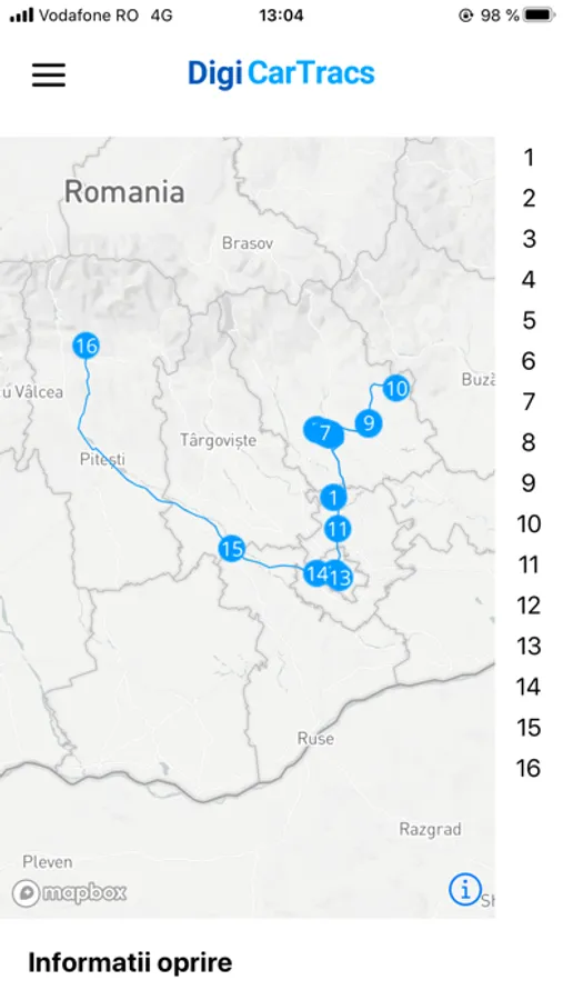 - vizualizare pe fiecare punct intermediar (locatie, ora inceput stationare, durata stationare, ora final stationare, distanta de la ultima stationare, timpul de la ultima stationare, viteza media si maxima de la ultima stationare, timpul de la start traseu, distanta de la start traseu).