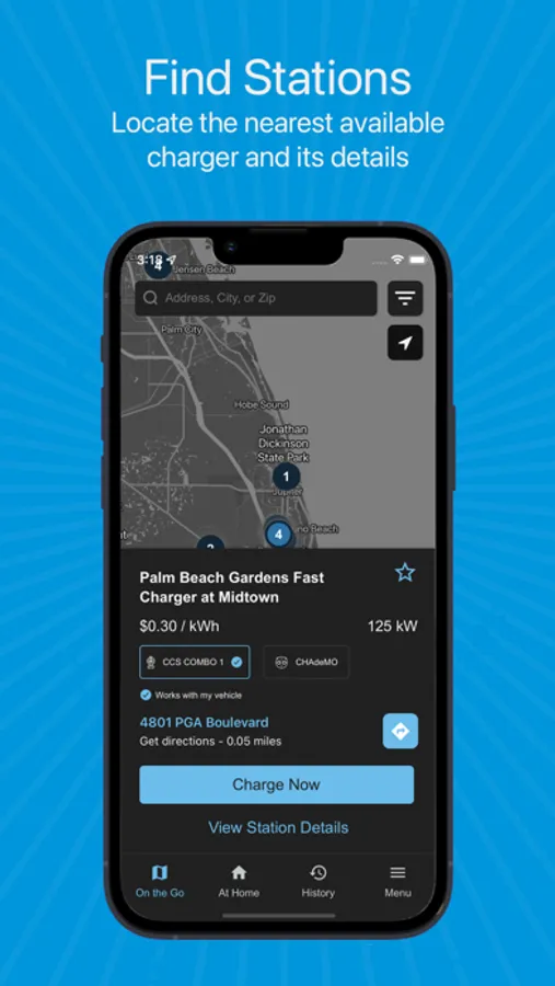 Find a Place to Charge: Locate charging stations nearby and get rerouted to the selected station.