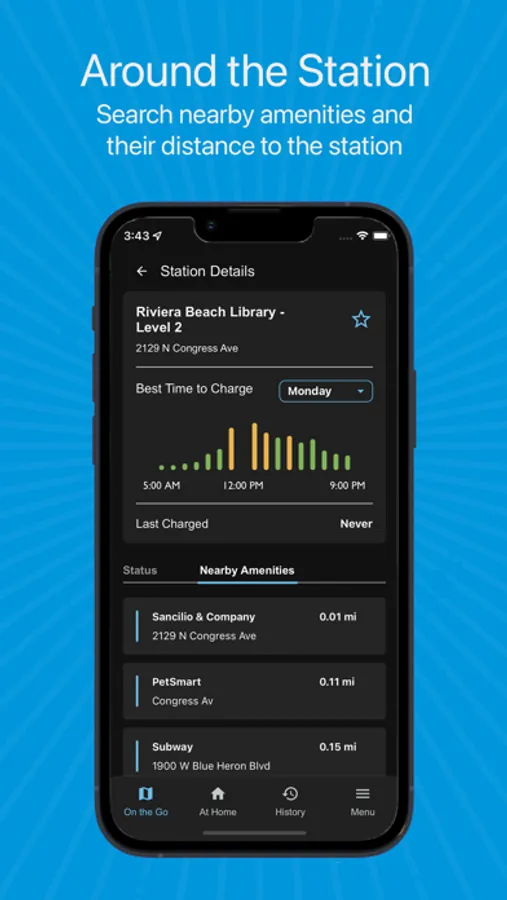 Charging Station Details: Port availability, energy cost, outages and nearby amenities.