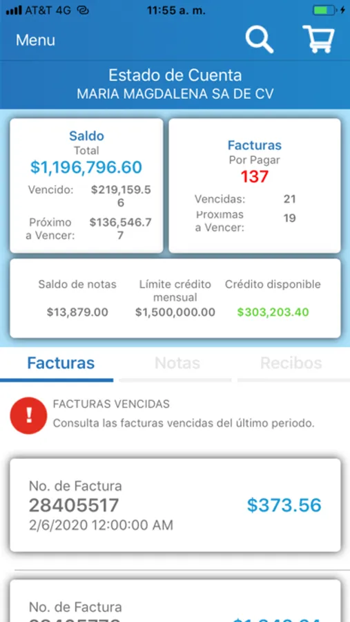 Estado de cuenta incluye número de facturas, próximas a vencer, vencidas, montos y notas de crédito.