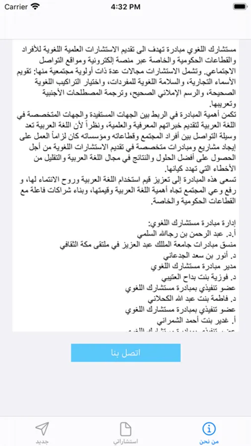 مستشارك اللغوي مبادرة تهدف الى تقديم الاستشارات العلمية اللغوية للأفراد والقطاعات الحكومية والخاصة عبر منصة إلكترونية ومواقع التواصل الاجتماعي. وتشمل الاستشارات مجالات عدة ذات أولوية مجتمعية منها: تقويم الأسماء التجارية، والسلامة اللغوية للمفردات، واختيار التراكيب اللغوية الصحيحة، والرسم الإملائي الصحيح، وترجمة المصطلحات الأجنبية وتعريبها.