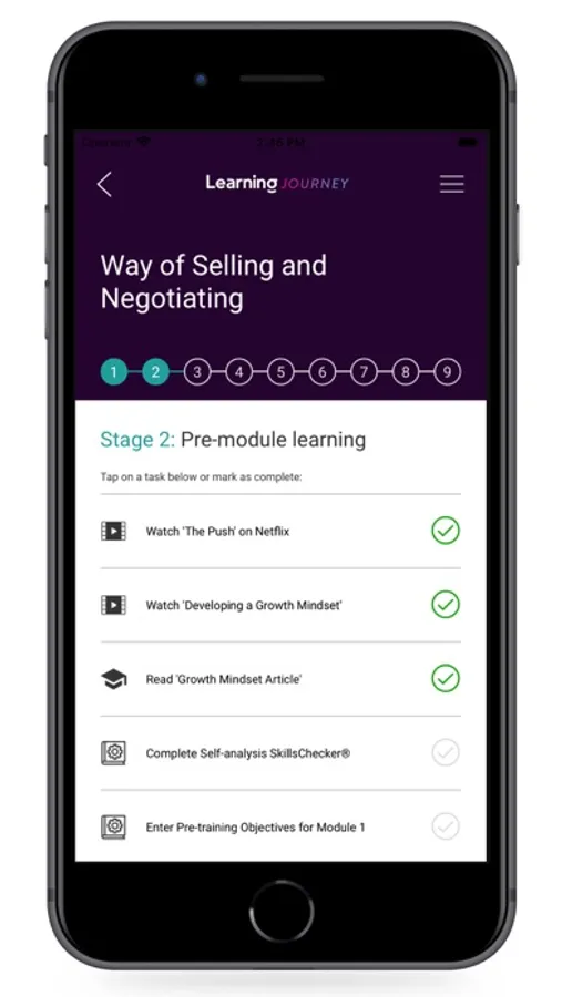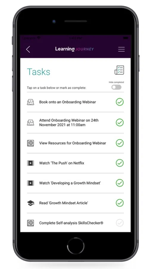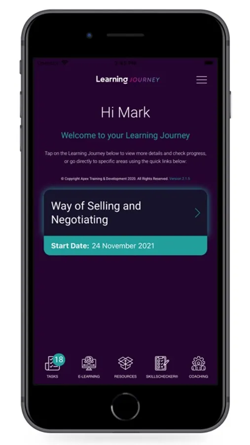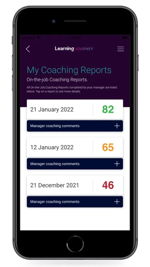 The App tracks where you are in a Learning Journey, allows you to join online events and delivers resources like video, images, documents, eLearning and audio files. It also helps organise and capture details of coaching conversations with your coach/manager.