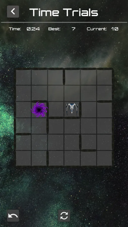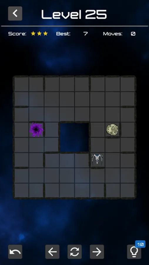 Command your ship to the wormhole within the asteroid belt in as few moves as possible. Objects in space will continue to move until they come into contact with another object. Use this to your advantage by moving meteors to shorten your path. Hundreds of ever more difficult puzzles await!