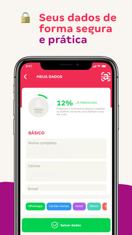 No Agilliza você poderá concentrar seus dados pessoais para acesso ou envio de forma rápida e segura, pois seus dados estarão salvos apenas no seu celular.