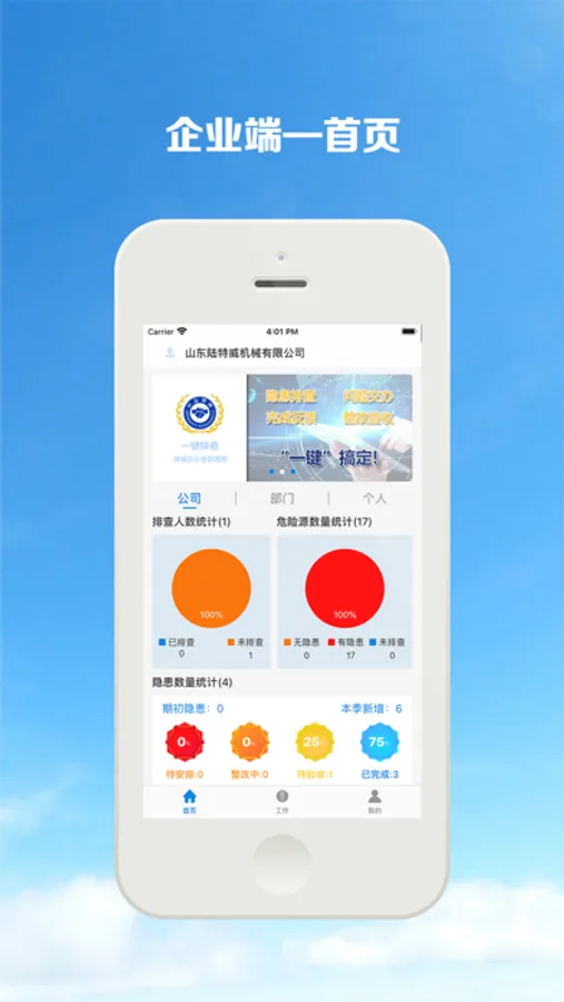 1.4首页展示员工及企业的隐患排查统计数据;发布页可由员工提交隐患给公司安全员,公司安全员负责进行隐患整改安排与整改完毕后的审核。