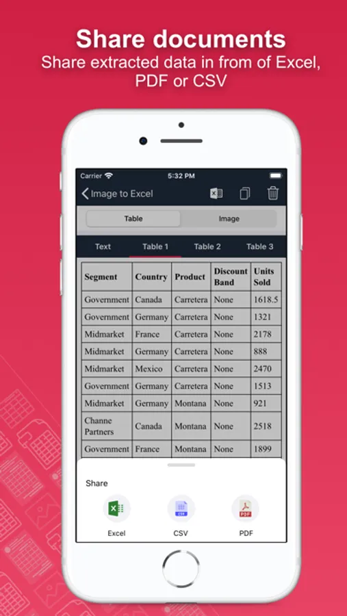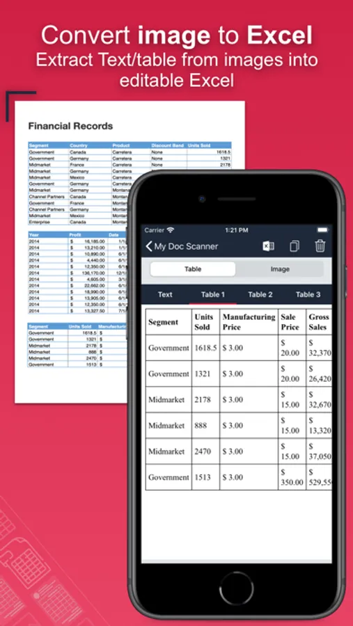 Extract both text & tabular data from image. Say goodbye to manually typing. Document scanner image to spreadsheet Converter also support the detection of tabular like structure data from image such as financial reports or medical records that have column names in the top row of the table followed by rows of individual entries. You can use this feature to automatically load the extracted data into Microsoft excel files. Extract tables from scanned images by converting it to spreadsheet and Adobe PDF.