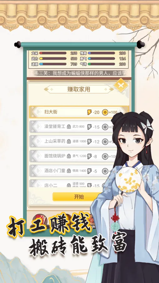 玩家在游戏中的年龄到达五岁后可解锁打工及资产选项,通过打工可获得大量的金币,金币可用来购买资产、日常用品以及送给女主礼物。房屋和马匹是解锁女主好感度的重要条件,可以针对喜欢的女主进行购买,也可以购买更多马匹当做投资,等价格上涨的时间卖出赚取金币。投资可通过消耗很少的金币大概率获得翻倍的金币数量,是积攒金币的最好途径。