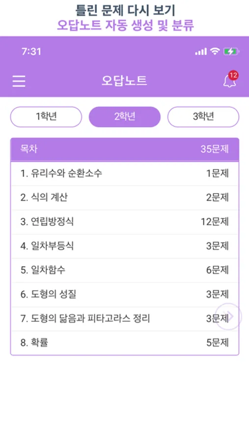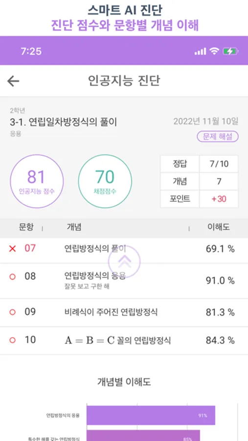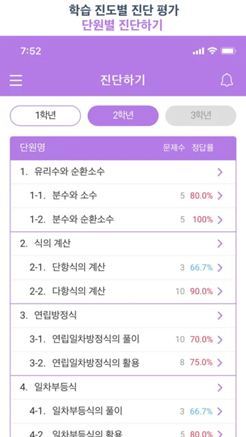 소단원 또는 대단원별 진단평가에 응시할 수 있으며, 풀이 결과를 인공지능이 분석하여 나의 진짜 실력과 취약개념을 쉽게 파악할 수 있습니다.