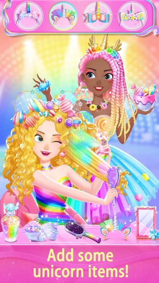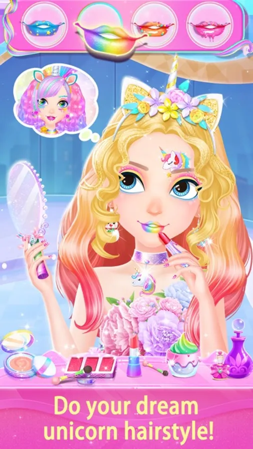 How do you want your hair done? Long or short, straight or curly... you are your own stylist for now. Here, we offer all the tools you want, scissors, curling irons... Oh, put some unicorn accessories on the hair, you'll absolutely like them. Whenever you have a place to go, just remember to come here and we'll make you shine.