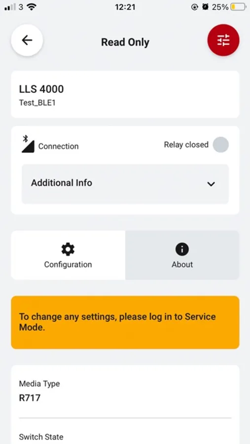 For the non-SIL2 variant of the LLS 4000, the app enables you to select between several media1 and select switch function as normally open (NO) or normally closed (NC).
