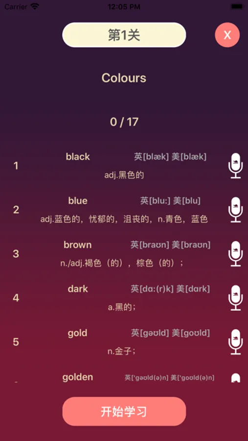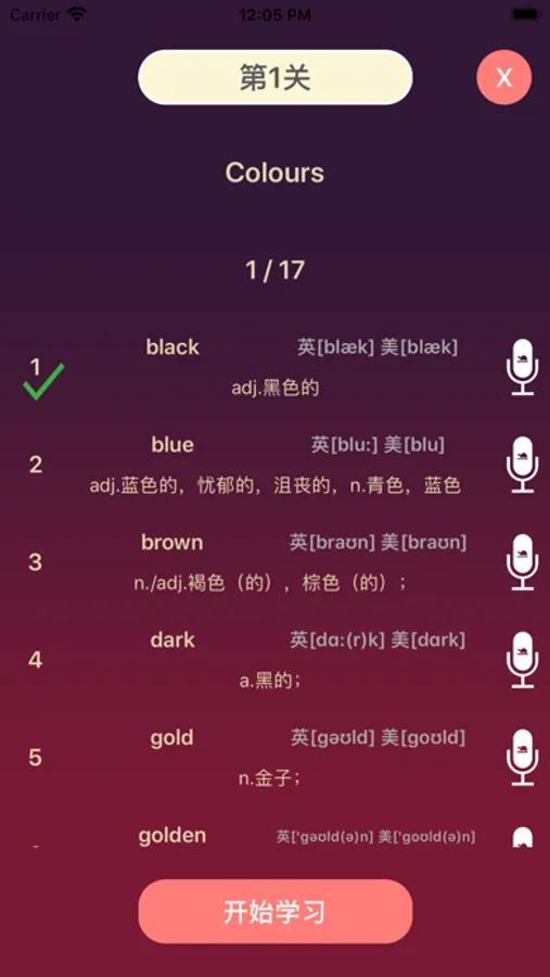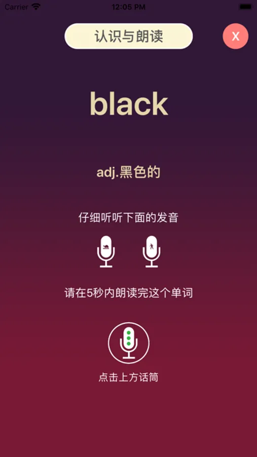 * 根据提示的单词原文和释义,通过聆听慢速和中速发音,了解认识单词;