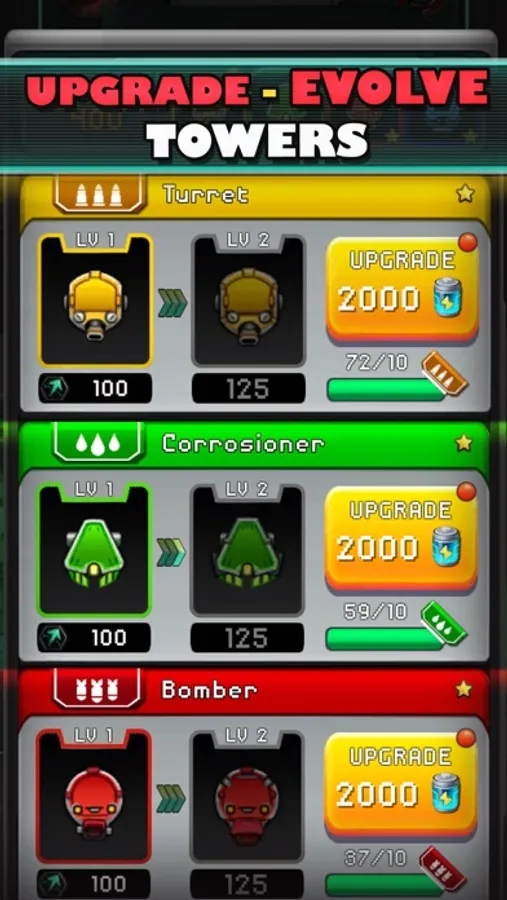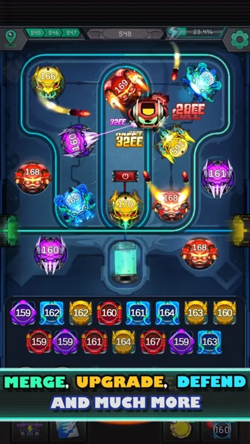 Merge towers by dragging ones of the same type and power on top of each other. Upgrade them to further their strength, even unlock new special attacks. You can also go out for a while, then come back and collect your battle rewards.