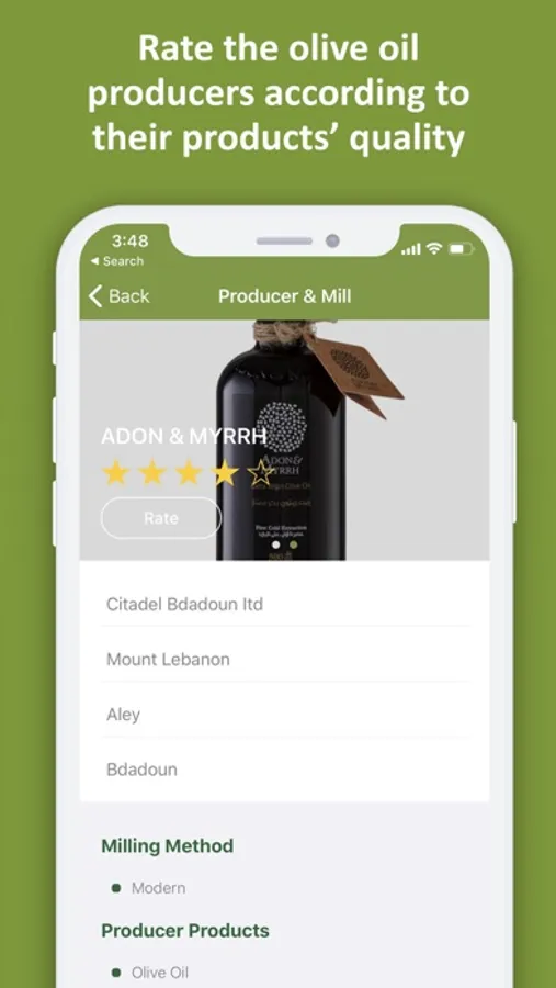 The app serves a dual purpose by linking and facilitating contact between consumers and local olive oil millers/producers thus solely promoting Lebanese high quality olive oil.