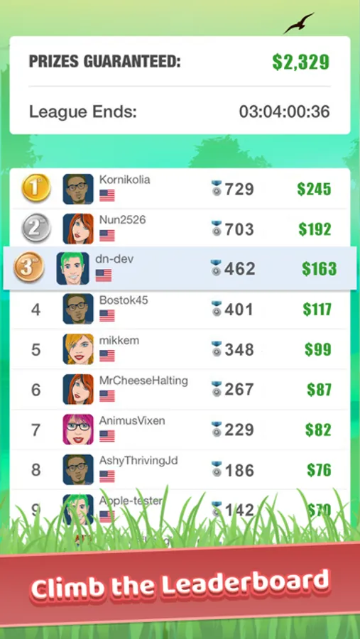 • Climb the leaderboard to earn real cash and many prizes.