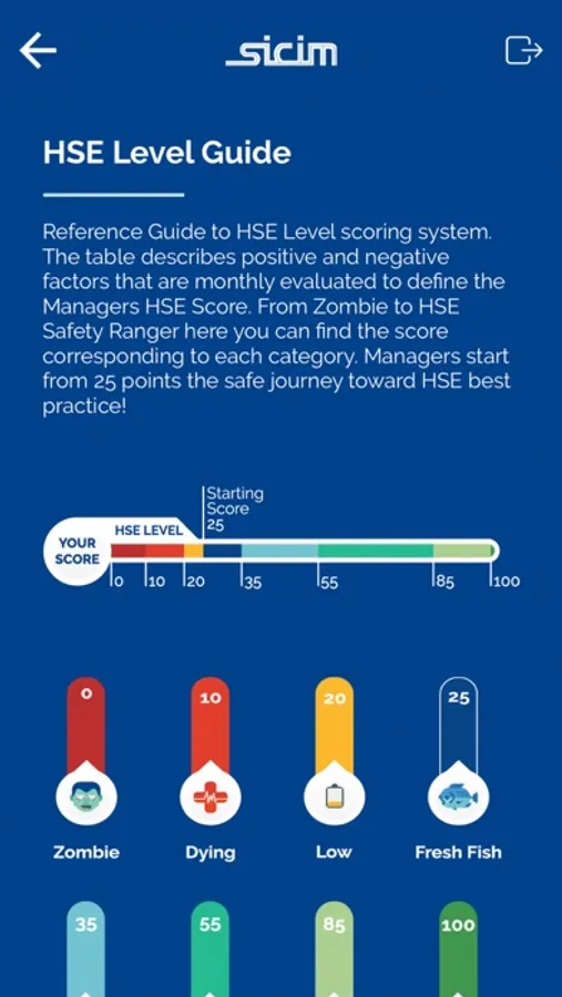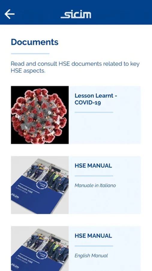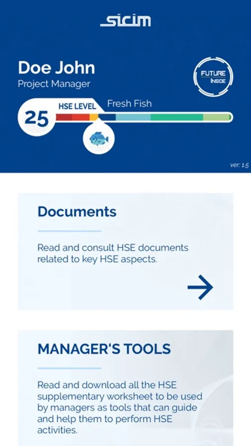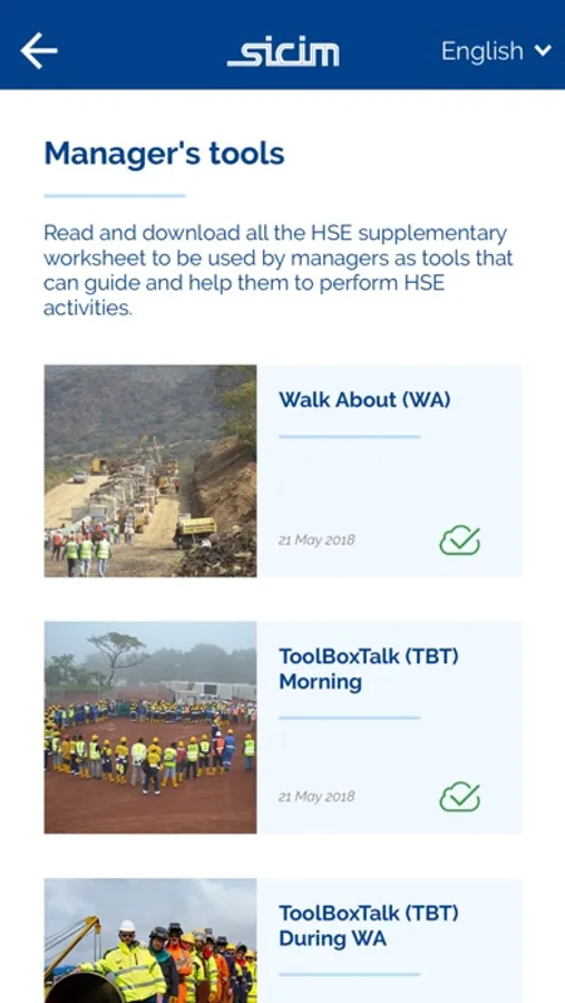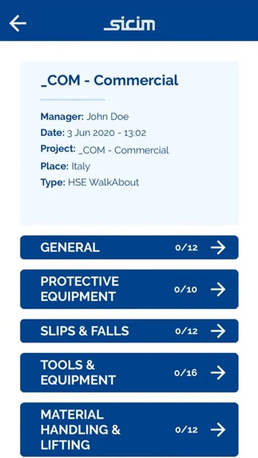 Its OffLine functionality allows direct and extensive use in remote areas workplaces typical for SICIM. The tool also has the purpose of motivating everyone to behaviours that are more suitable, more preventive and less toxic, with the aim of definitively decrease the number of accidents to people.