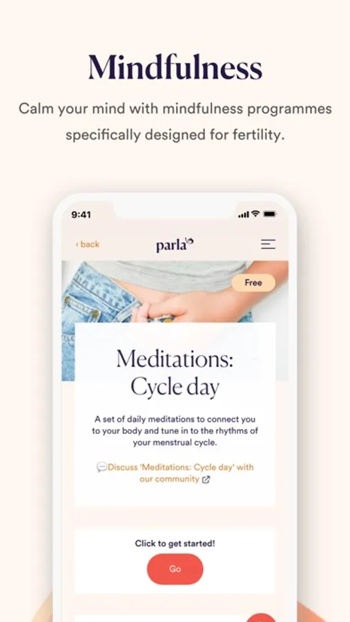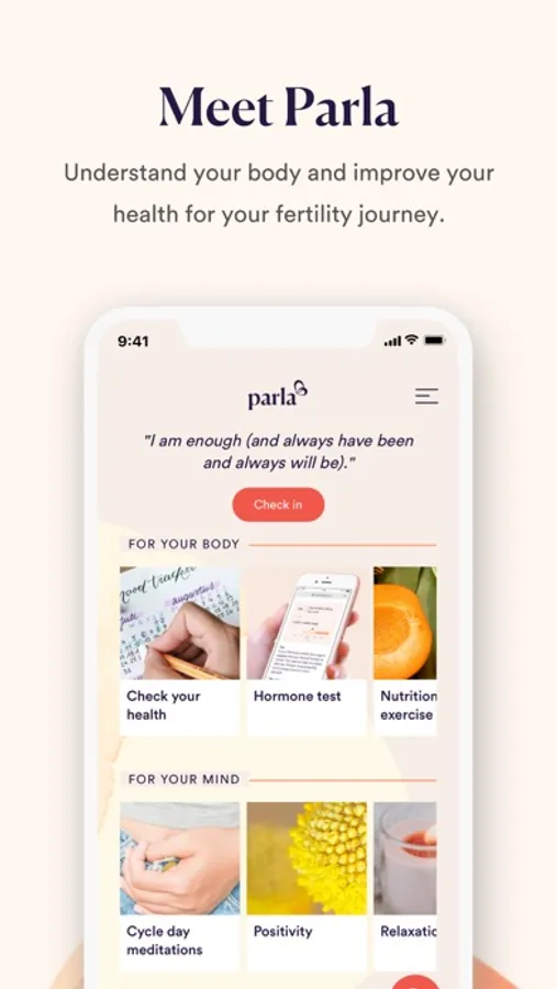 Parla means to speak -- and we think its time we change the conversation around fertility. Forget the taboos and confusion -- whether you're just planning ahead or already trying Parla is here for you. Learn about your body, how to improve your health, and how to think through the whatever comes your way. Parla. You'll be able to easily assess your health, connect with health specialists including nutritionists and fertility experts, access a range of mindfulness and educational audio guides to get smart and stay calm.