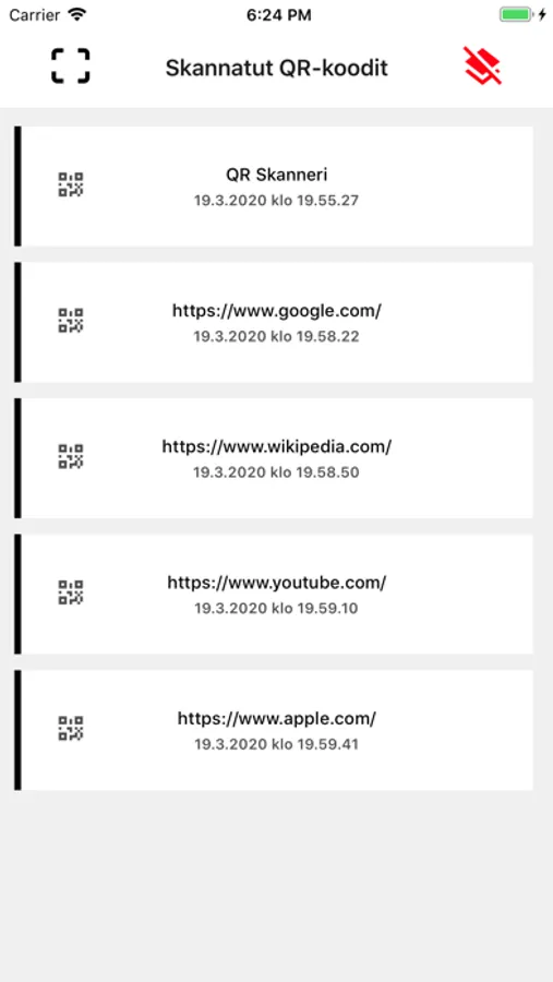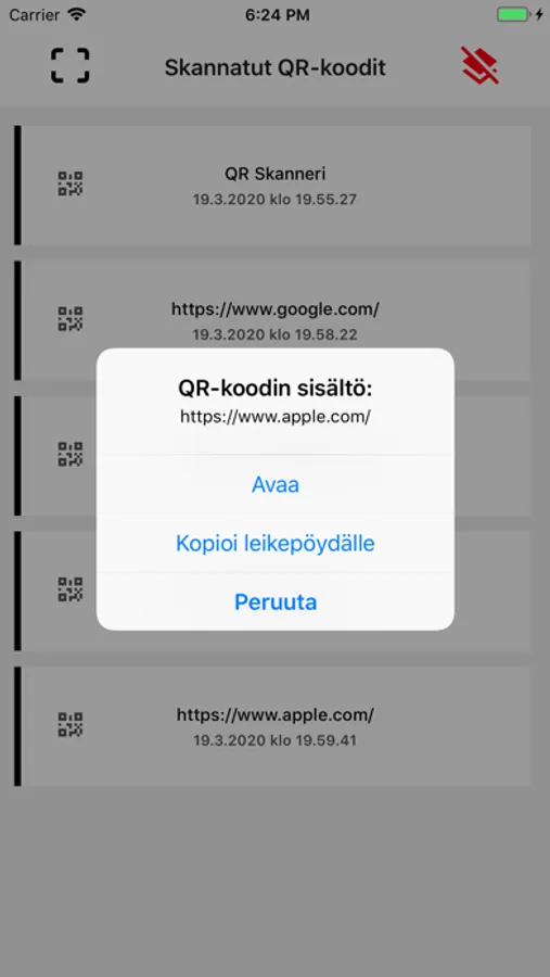 - Luetut QR-koodit tallentuvat puhelimesi muistille, joten voit katsella niitä myöhemmin.