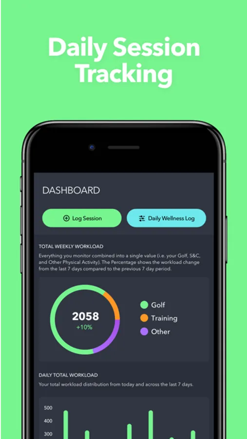 Strength and Conditioning: Like to train to improve your golf? Logging all your sessions means you gain valuable insights into how your training priorities develop over time, how your workload is influencing your daily wellbeing, and how other physical activity impacts on your total workload. Adjust your training workload based on your reported measures of Daily Wellness ensuring your training is adapted to your current energy, motivation and recovery from previous sessions.