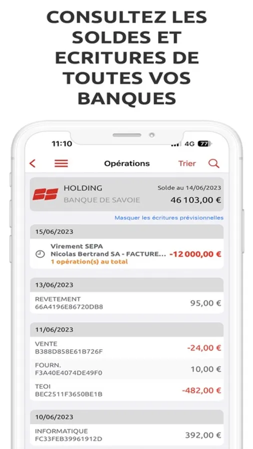 - Consultez les soldes et écritures de l’ensemble de vos comptes dans toutes vos banques gérées dans votre solution « Suite Entreprise »