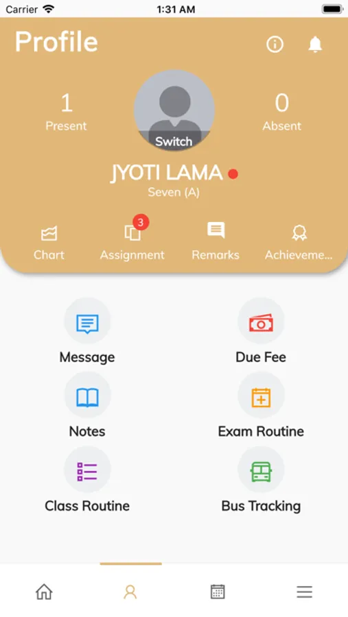 The parent can view all the information of their child i.e. remarks from teachers, assignments, fee information, school notice, class routines and exam routines, calendar and events, and real time chat with the school staffs. Parents will receive notifications for any update on their child, i.e "the student is present today" notification after teacher takes the attendance.