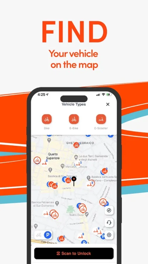 1. FIND the closest bike, e-bike or e-scooter available on your map