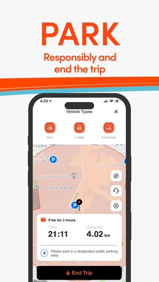 3. PARK responsibly inside the operational area and LOCK your vehicle by ending the ride on your app.