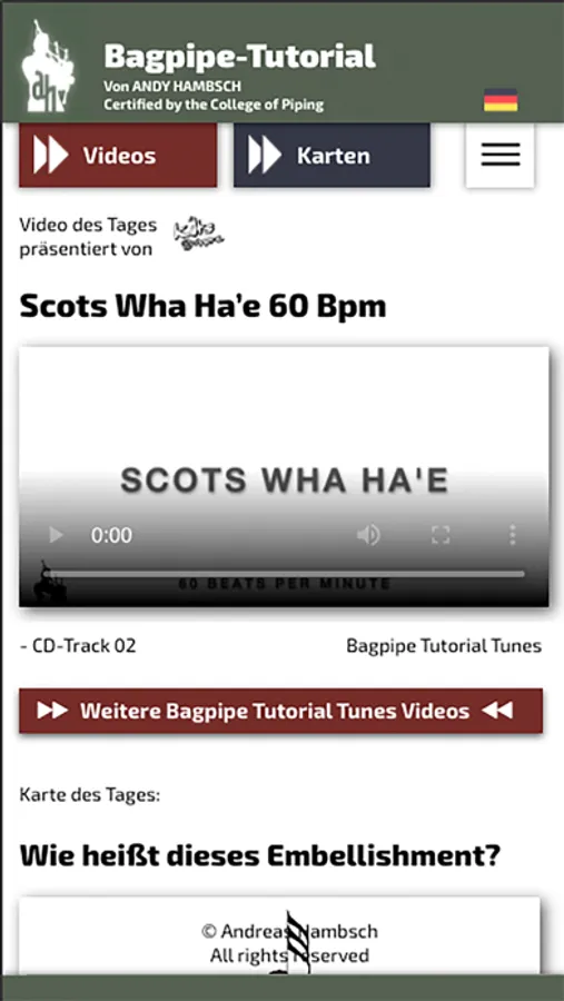 This Bagpipe-Tutorial-App by Andreas Hambsch is a milestone in the teaching of the Scottish bagpipes. Easily understandable and thorough, it is a worthwhile investment for anyone interested in piping. The Bagpipe Tutorial book, also by Andreas Hambsch, is an ideal supplement.