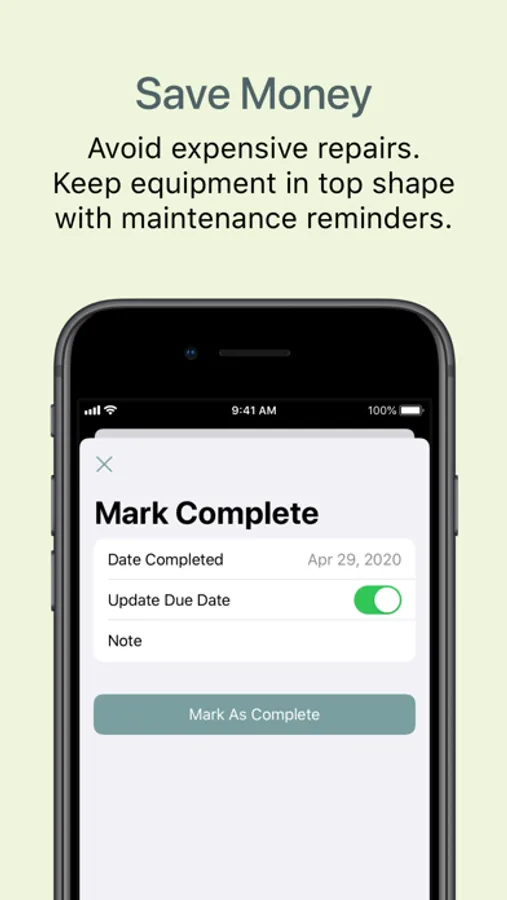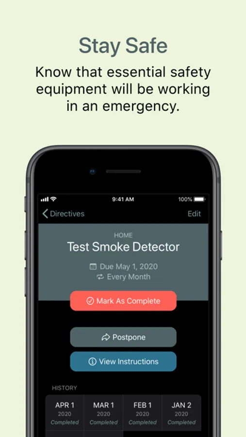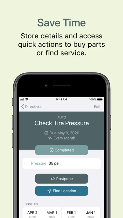 A couple taps let you log a task as complete, and Directive will keep a record of it, along with any notes you saved, and then set up a reminder for the next time it's due. Look back any time at your maintenance history.