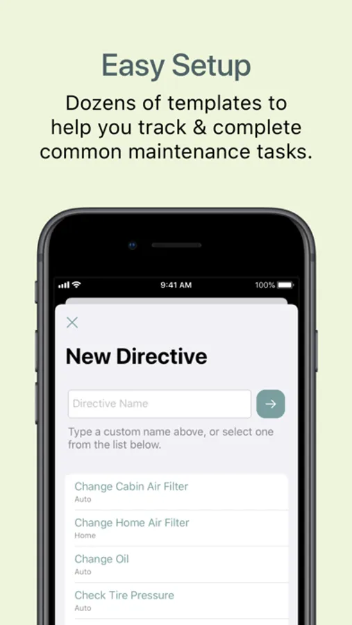 Directive includes dozens of templates to help you set up the maintenance tasks you want to complete. Then, it sends you notifications when it's time to complete routine maintenance.