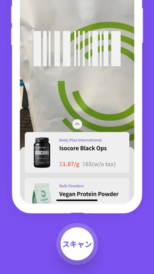 プロテインsearchアプリとは、写真、バーコードなどでプロテインを簡単に検索することができ、たんぱく質1gあたりの値段がいくらかという表示もされているため、価格の安いプロテインを見つけることがきます。