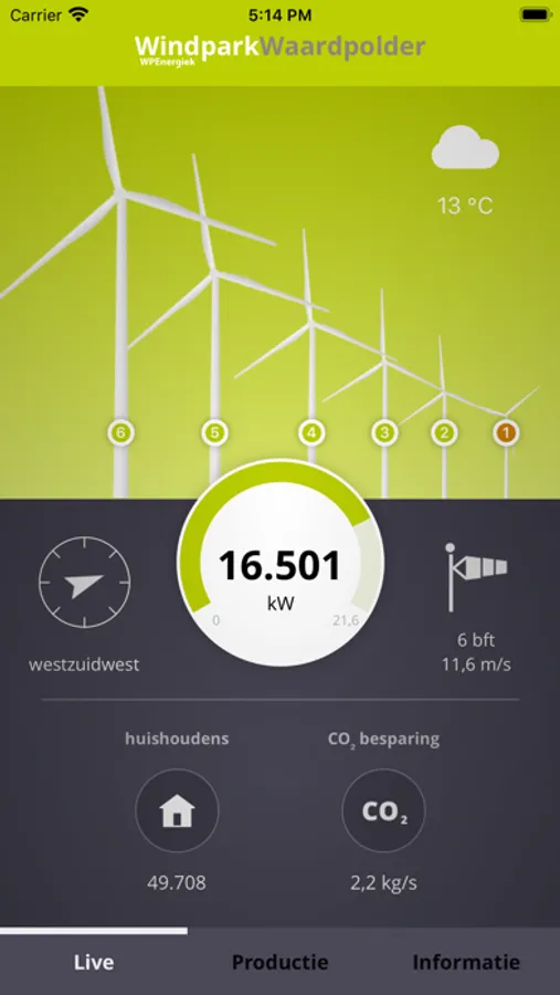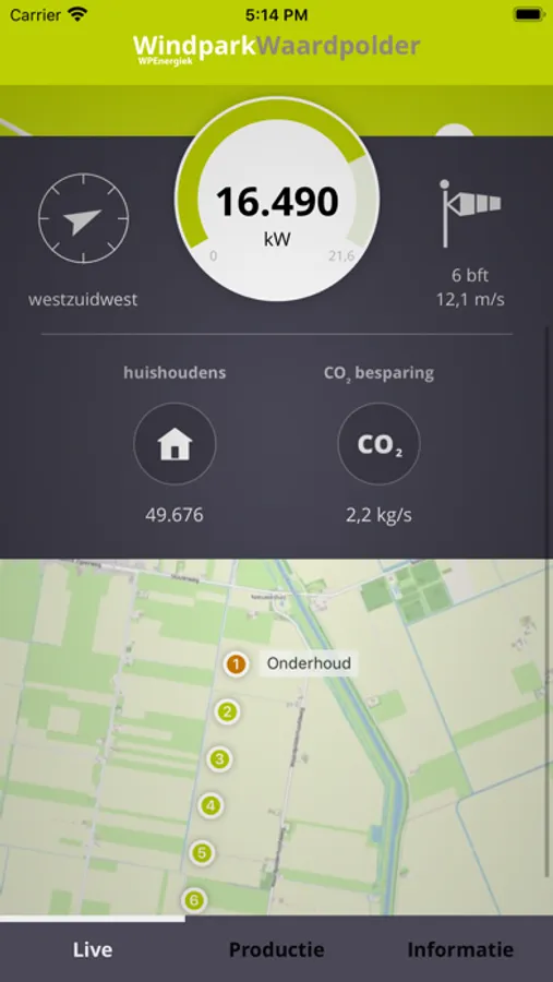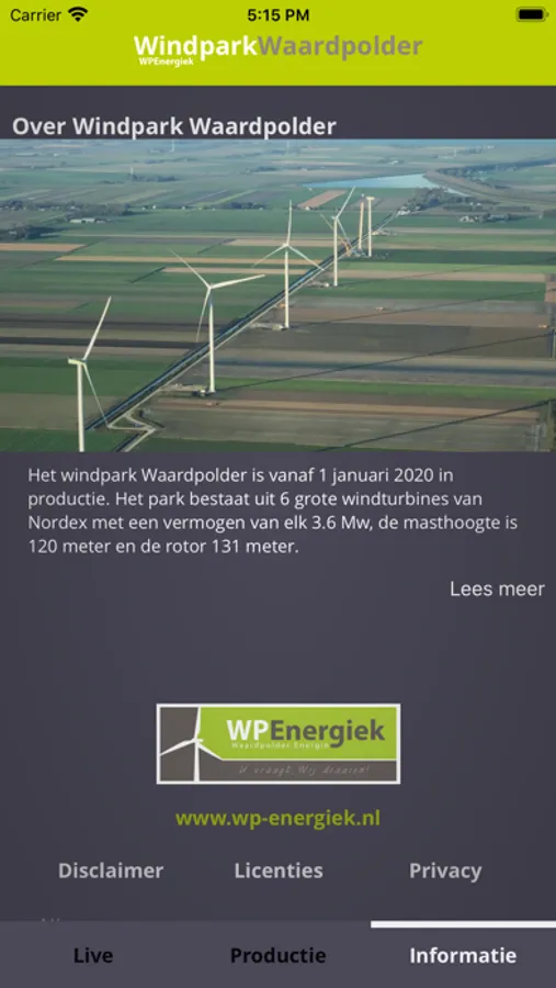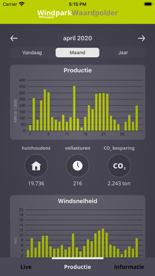 De app van Windpark Waardpolder geeft de actuele elektriciteitsproductie, status en weersomstandigheden van het windpark weer. Ook kunt u de historische productie en windsnelheden van bijvoorbeeld gisteren of de vorige maand bekijken.