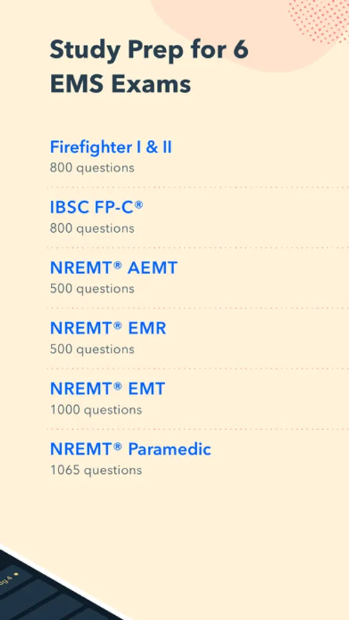 EMS Pocket Prep gives you access to study prep for 6 different emergency services exams all in one place, with 500-1065 practice questions for each exam.