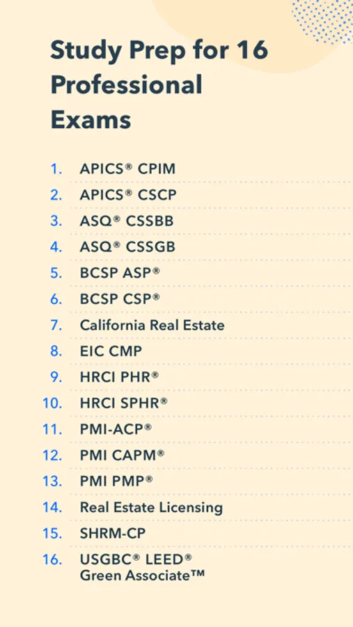 Professional Pocket Prep gives you access to study prep for 17 different professional exams all in one place, with 500-1600 practice questions for each exam.